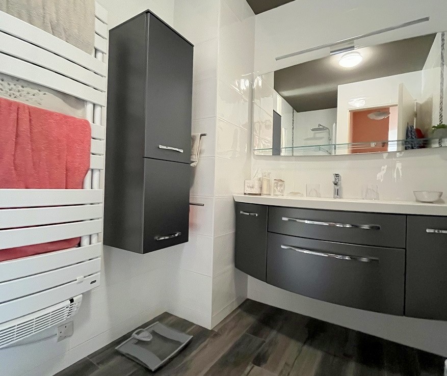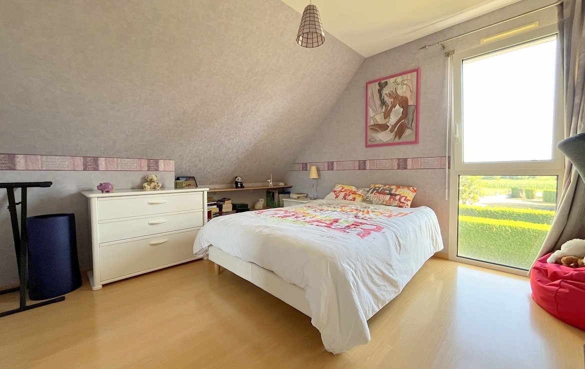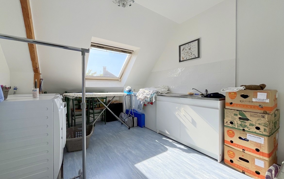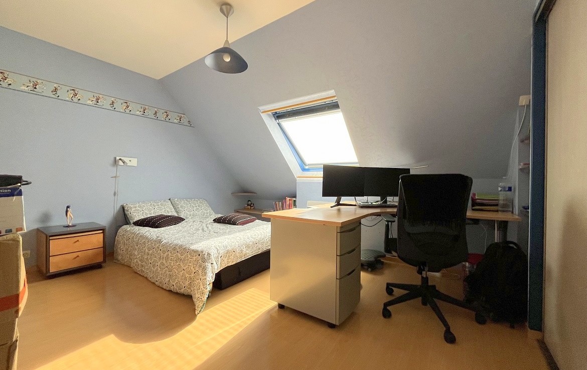 A l’étage, retrouvez un palier (bureau), 3 chambres avec placards, une lingerie, une salle de bain avec double vasque et un wc.
